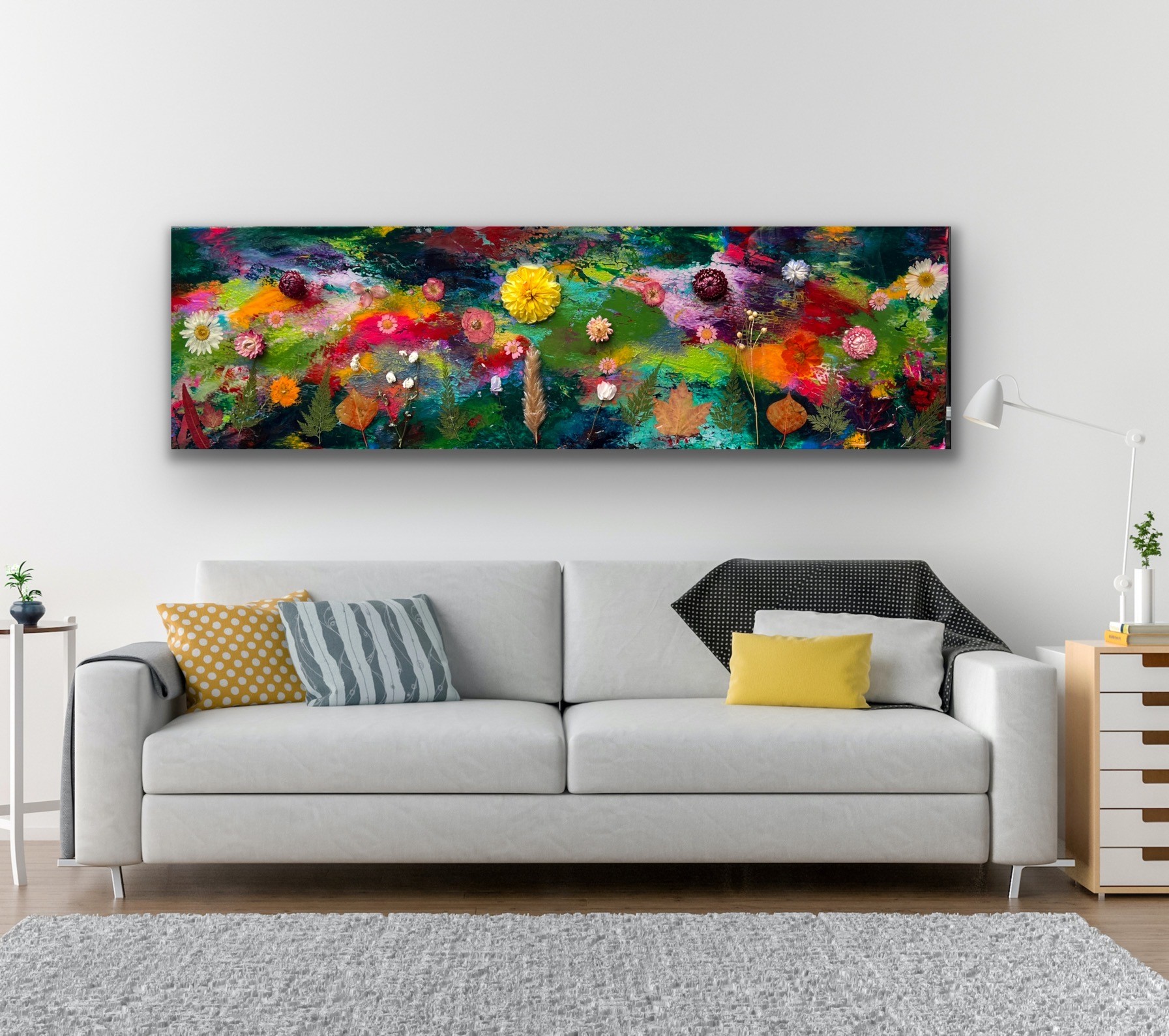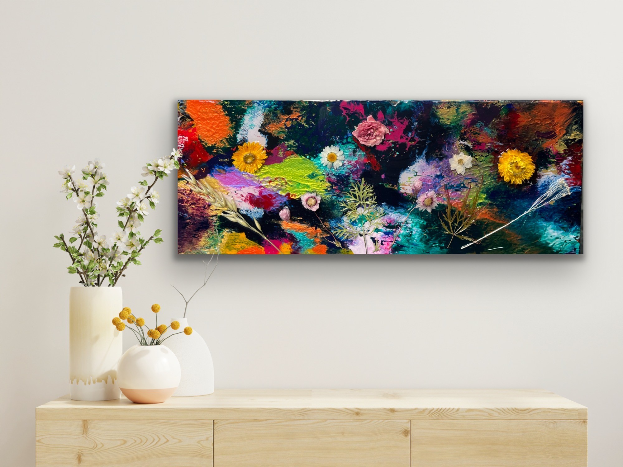 SOLD Blooming Marvellous 3. Mixed Media on canvas with real flowers & resin. 30 x 100cm