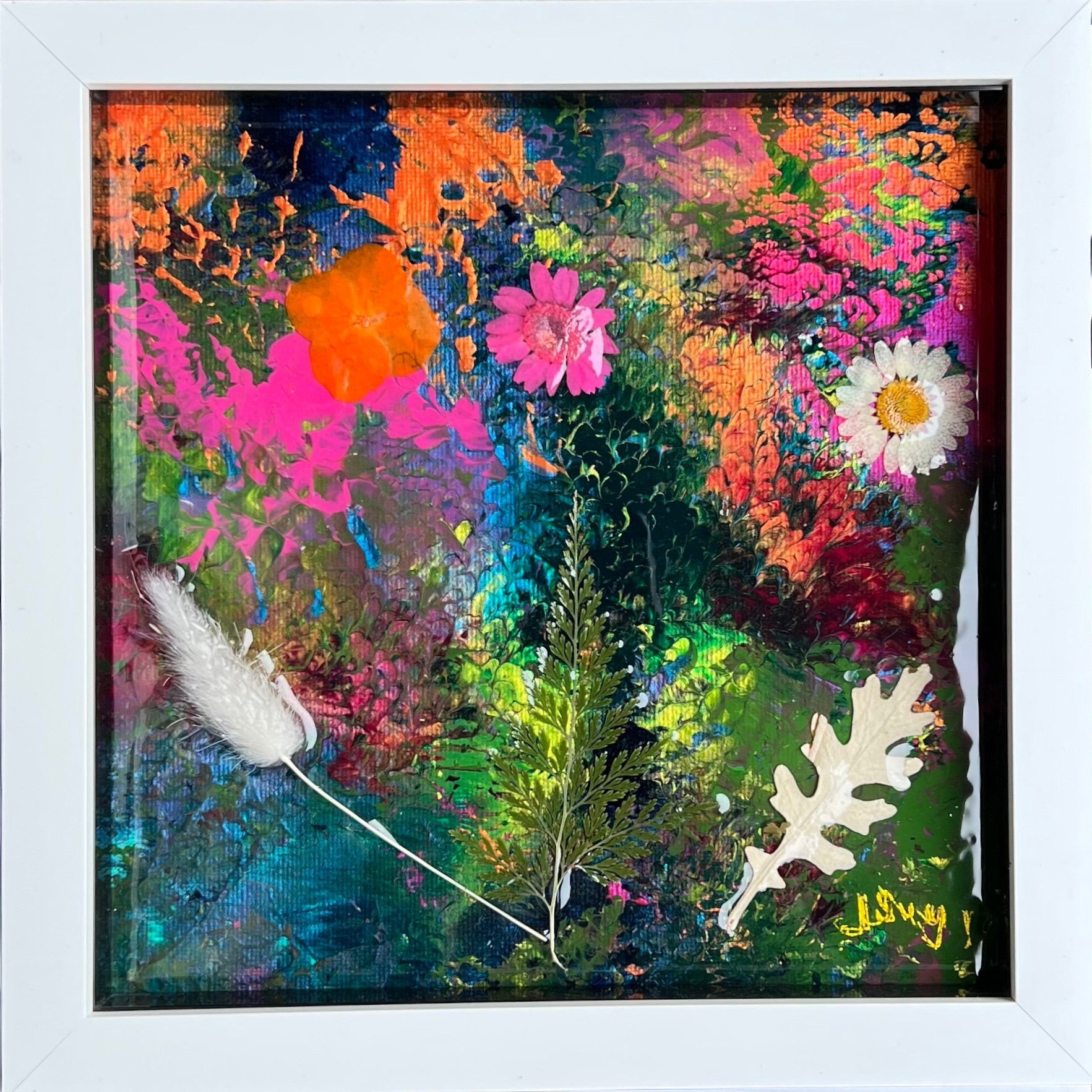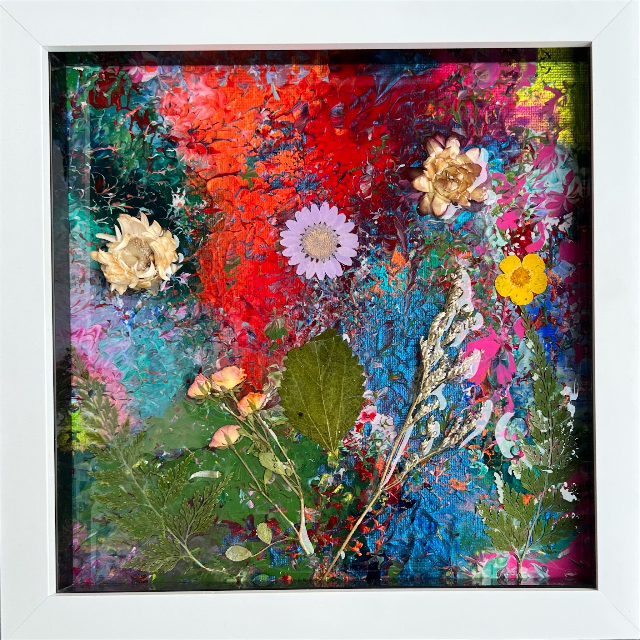 Blooming Marvellous Mini. Framed Mixed Media on canvas with real dried flowers and resin. 23 x 23cm £80 Each